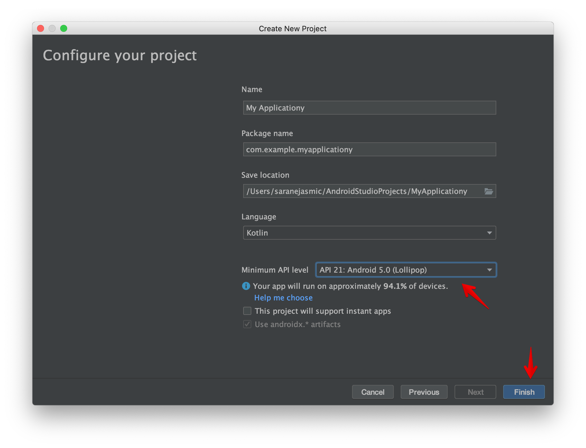 4. On "Configure your project" step, you can change project name, where to save the project, etc. You can only change Minimum API level to API level 21. Click on Finish button.