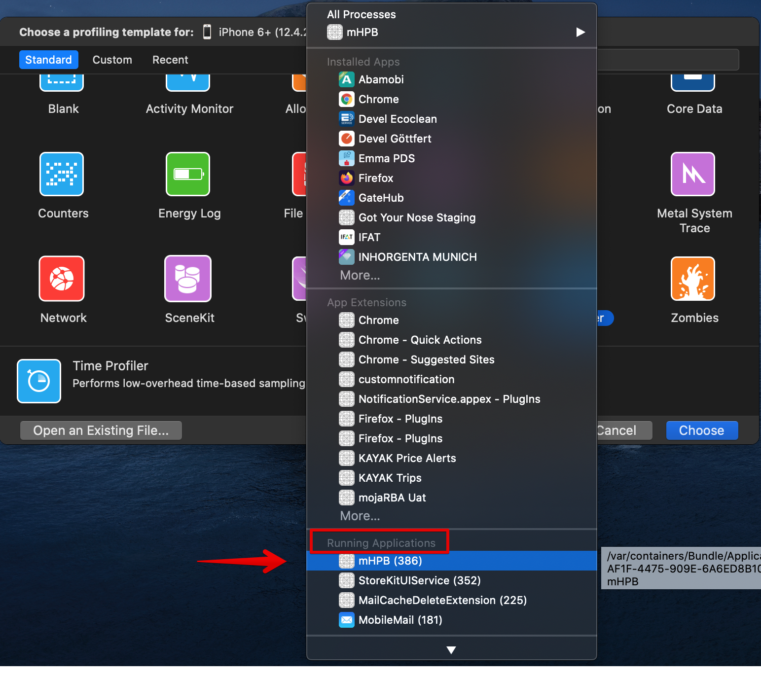 1. Connect an iPhone with Macbook and open the app you want to profile (this is important because it won't work if the app is closed).