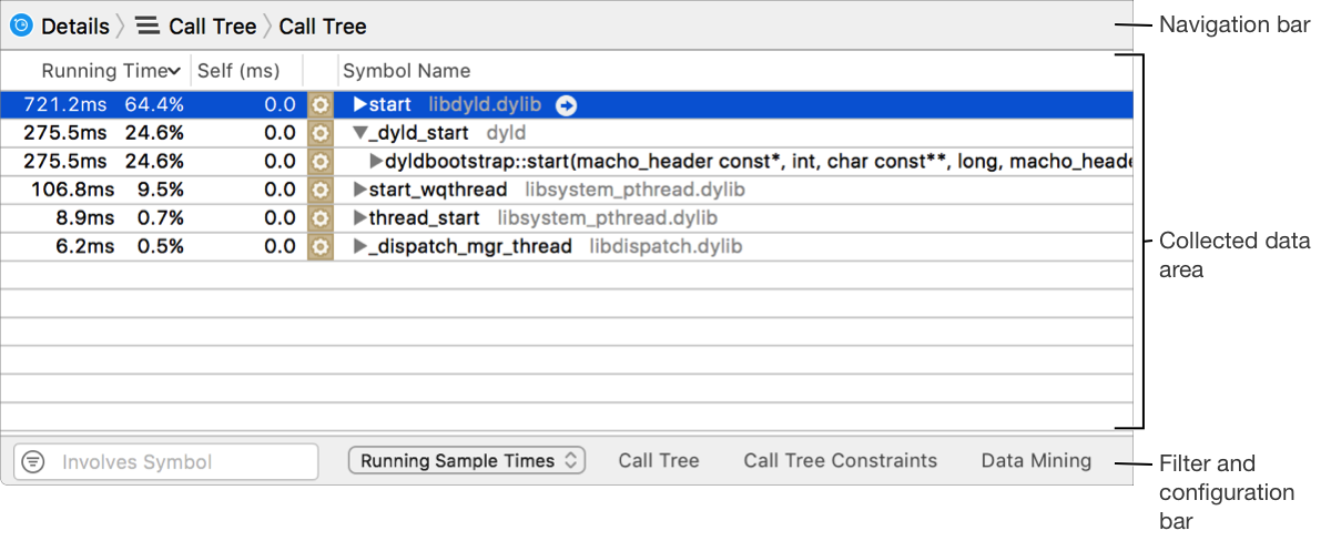 • The collected data area shows you all of the data for the selected instrument, typically in tabular format. The content displayed here varies significantly from instrument to instrument. For example, the Activity Monitor instrument displays process, CPU, and thread information, and much more.