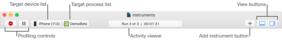 • Toolbar: Allows you to start, pause, and stop data profiling, add instruments, hide and show panes, and more.