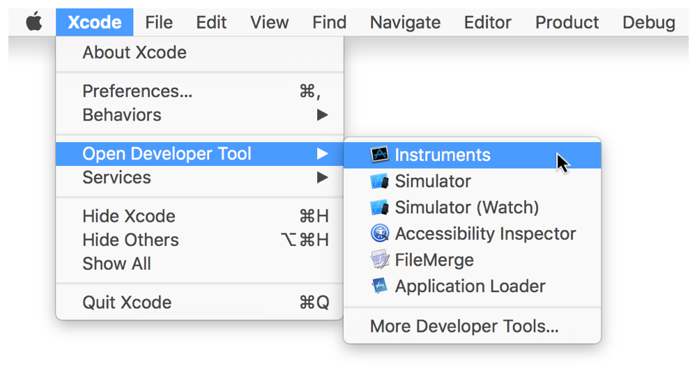 2. In Xcode, choose Xcode > Open Developer Tool > Instruments.